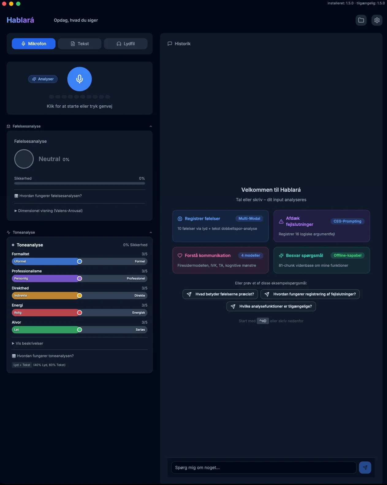 Lydoptagelser, transskriptioner, AI-analyseresultater, konfigurationsindstillinger. Hablará er ikke en medicinsk enhed og stiller ikke diagnoser.