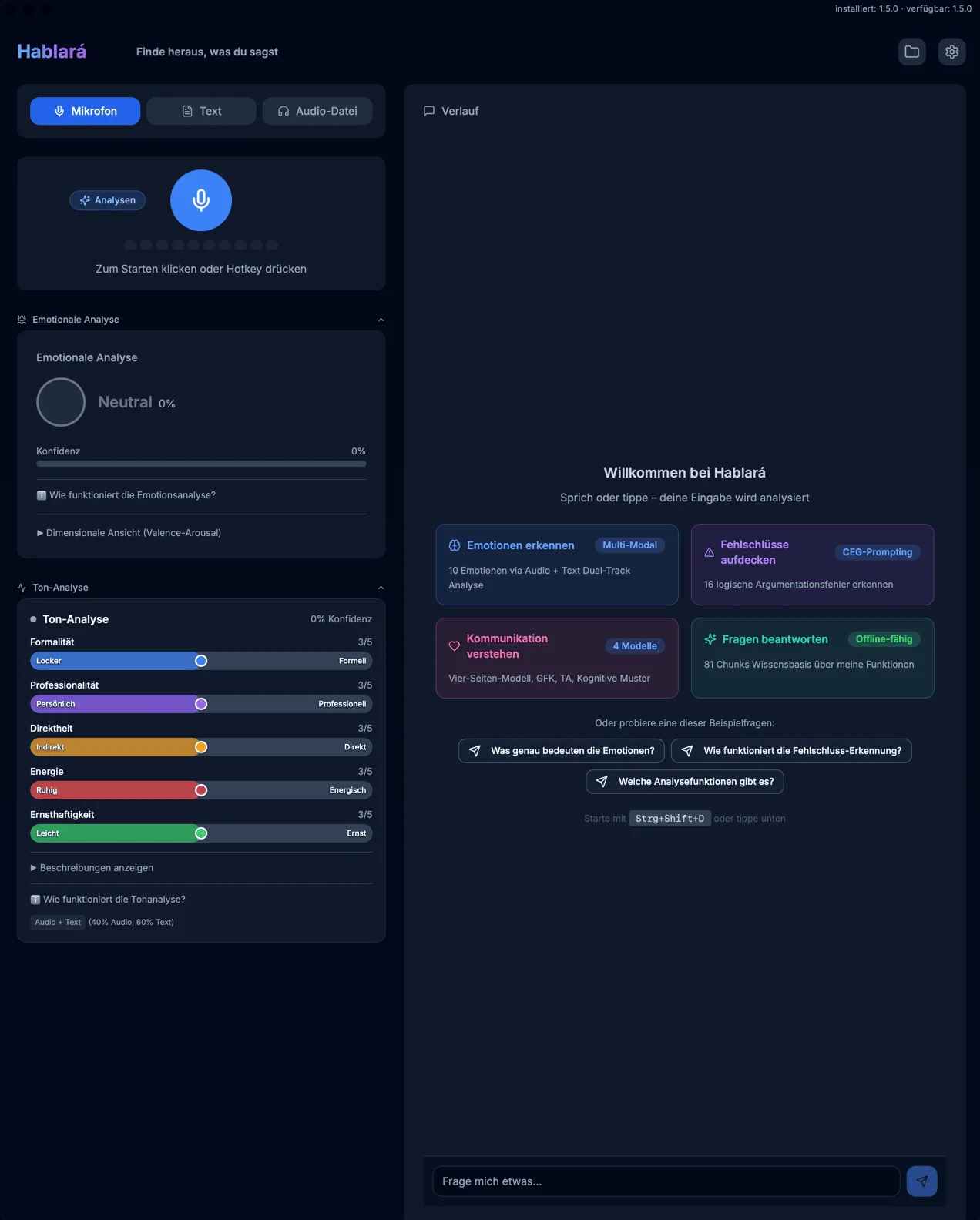 Hinweis zu Art. 9 DSGVO: Hablará ist kein Medizinprodukt und erstellt keine Diagnosen. Die psychologisch-informierten Analysen (Emotionserkennung nach Plutchik, GFK nach Rosenberg, kognitive Verzerrungen nach Beck) dienen ausschließlich der Selbstreflexion. Die Verarbeitung erfolgt lokal auf Ihrem Gerät; bei Cloud-Nutzung auf Grundlage Ihrer ausdrücklichen Einwilligung (Art. 9 Abs. 2 lit. a DSGVO).